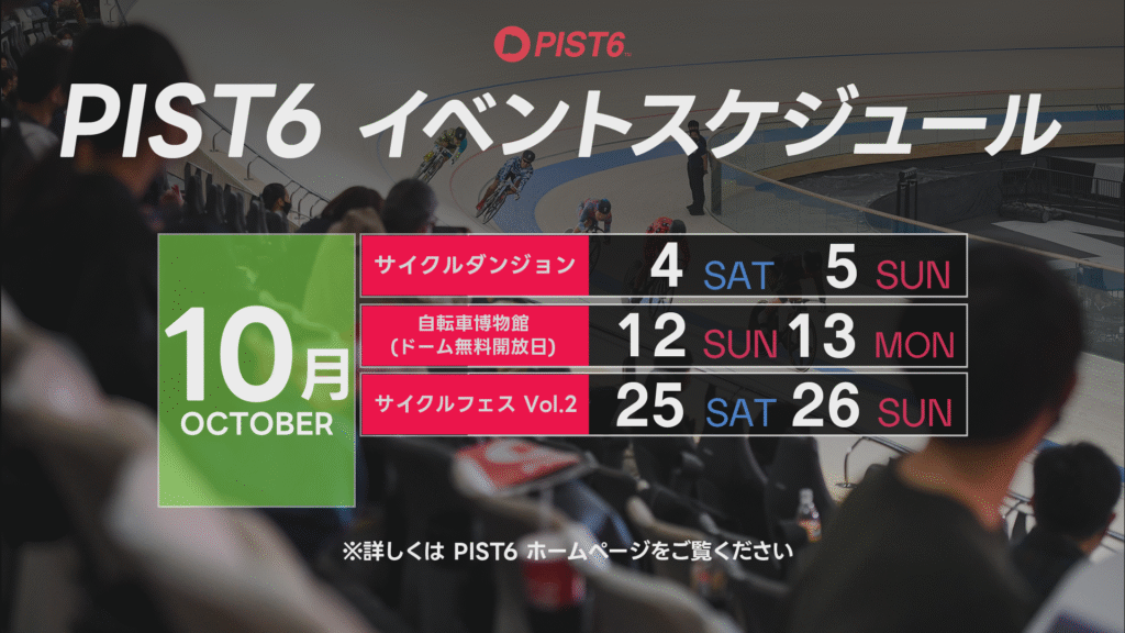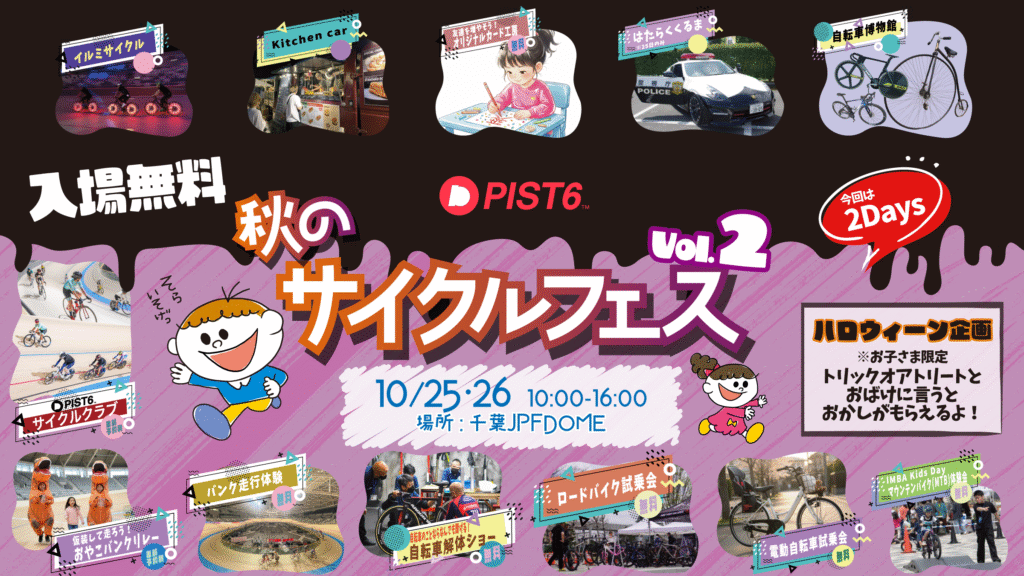 2025年10月における千葉JPFドームのイベント日程、無料開放日をお知らせいたします。いずれのイベントも入場無料、チケット取得なしでお楽しみいただけます。 ■10月のPIST6イベントスケジュール 【2025年10月のPIST6イベントスケジュール】●PIST6サイクル... 選手