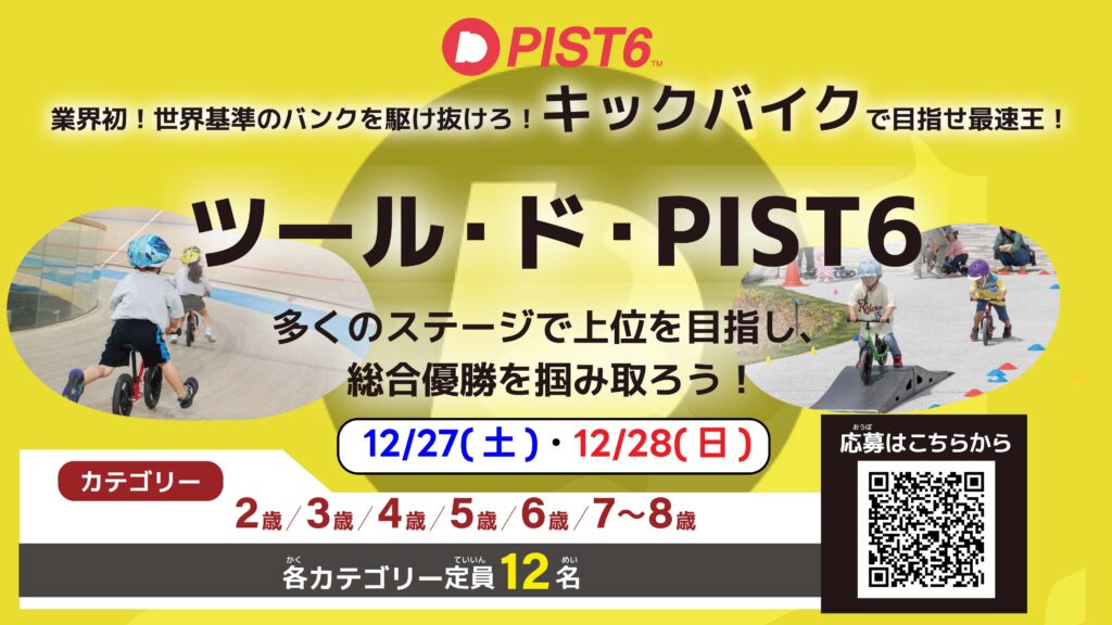 12月27日(土)・12月28日(日)開催!世界基準の250m木製コースで行われる、キックバイクレース『ツール・ド・PIST6 STAGE2』!STAGE 1は11月15日(土)・11月16日(日)に開催予定!エントリー&詳細はこちら ■ツール・ド・PIST6とは? 複数回に渡って行われ... イベント