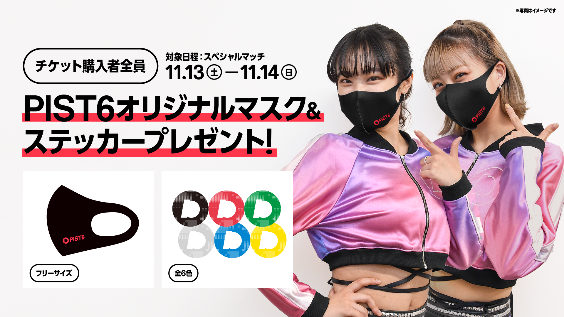 有観客開催の初日となる2021年11月13日(土)〜14日(日)の「PIST6 Championship JAPAN HEROES」スペシャルマッチにおいて、観戦チケット購入者全員に「PIST6オリジナルマスク」と「PIST6ロゴステッカー」をプレゼントいたします。