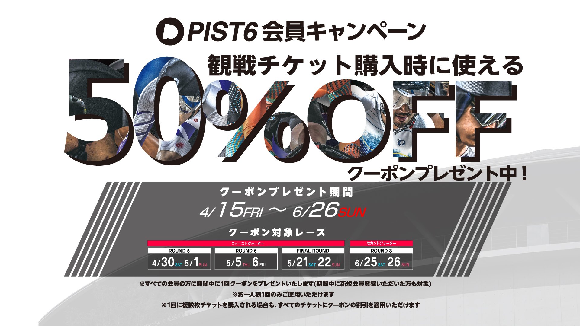 本日2021年12月28日(火)~2022年1月31日(月)までの期間中、PIST6会員登録キャンペーン第2弾として、観戦チケット購入時に使用可能な「50%OFFクーポン」をプレゼントいたします。