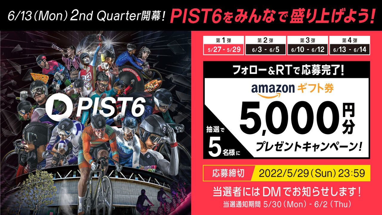 PIST6の公式Twitterアカウント( @pist6_official )にて、2022年5月27日(金)~5月29日(日)、6月3日(金)~6月5日(日)、6月10日(金)~6月12日(日)、6月13日(月)~6月14日(火)の計4期間、フォロー&対象の投稿をリツイートで抽選で5名様にAmazonギフト券が当たるキャンペーンを実施いたします。