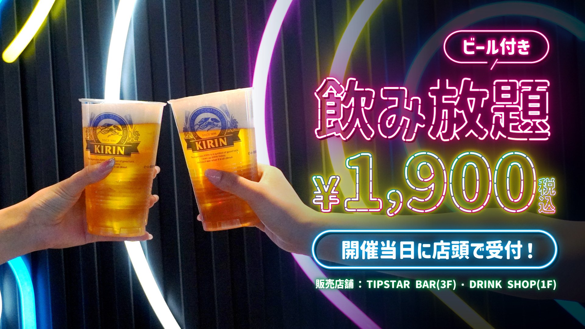 1Fメインエントランス『DRINK SHOP』または3Fスタンド『TIPSTAR BAR』にて受付