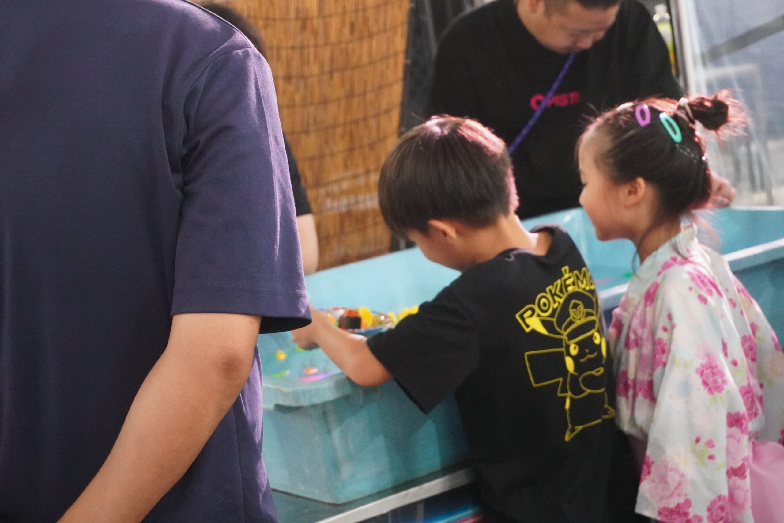 デイ開催では、アリーナ内に縁日やかき氷などの屋台が出店。水上に浮かびキラキラ輝くおもちゃをすくう『ひかりものすくい』、たくさんあるヒモの中から自分が欲しい”当たり”を狙う『千本釣り』などに子供達は大盛り上がり!