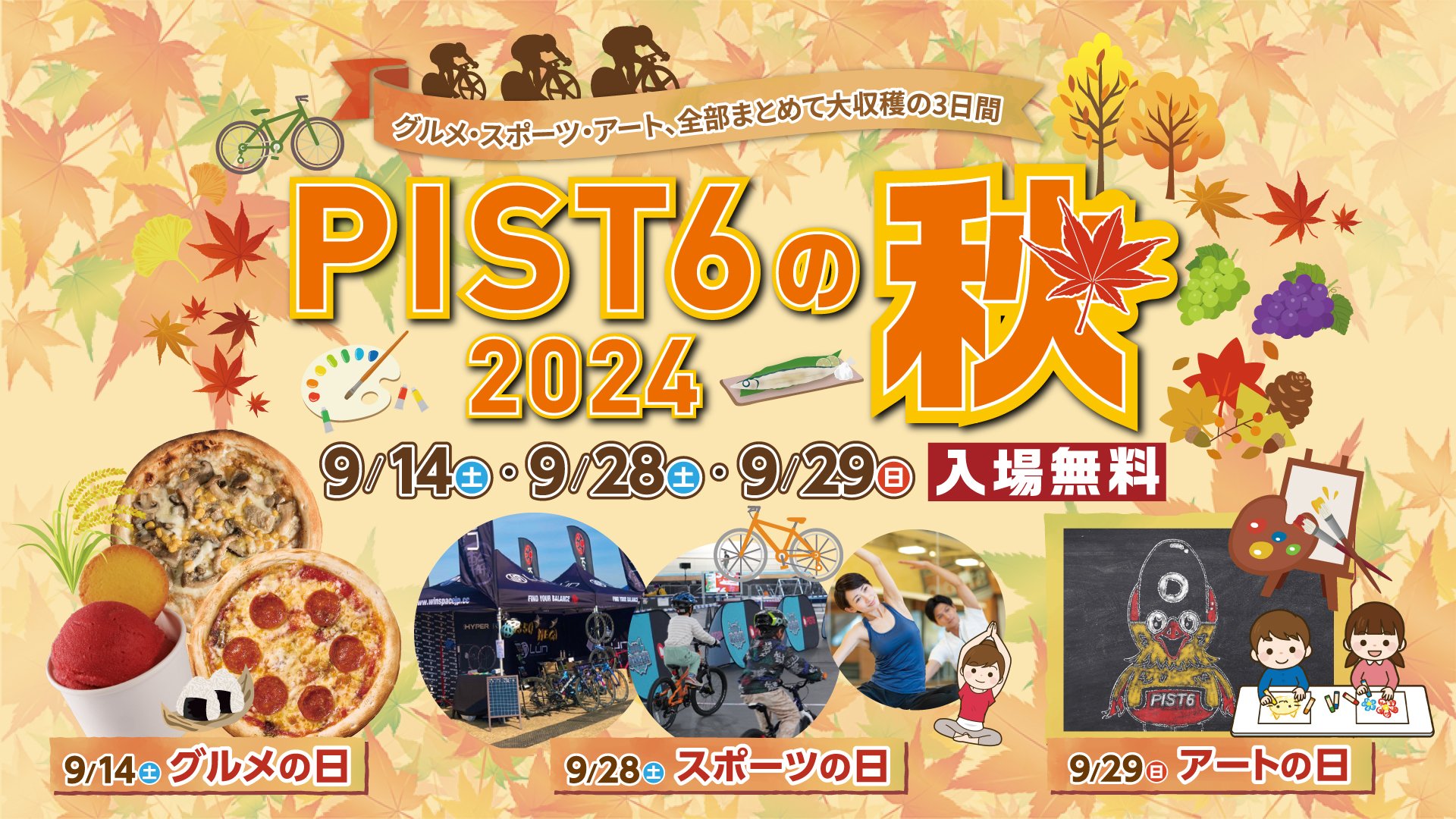 9月のA日程(土日)開催となる9/14(土),9/28(土),9/29(日)の3日間では『PIST6の秋2024』と題して、それぞれ”食”・”スポーツ”・”芸術”が楽しめるイベントをご用意して皆様をお待ちしております。PIST6で秋の魅力を楽しみつくそう!(入場無料)
