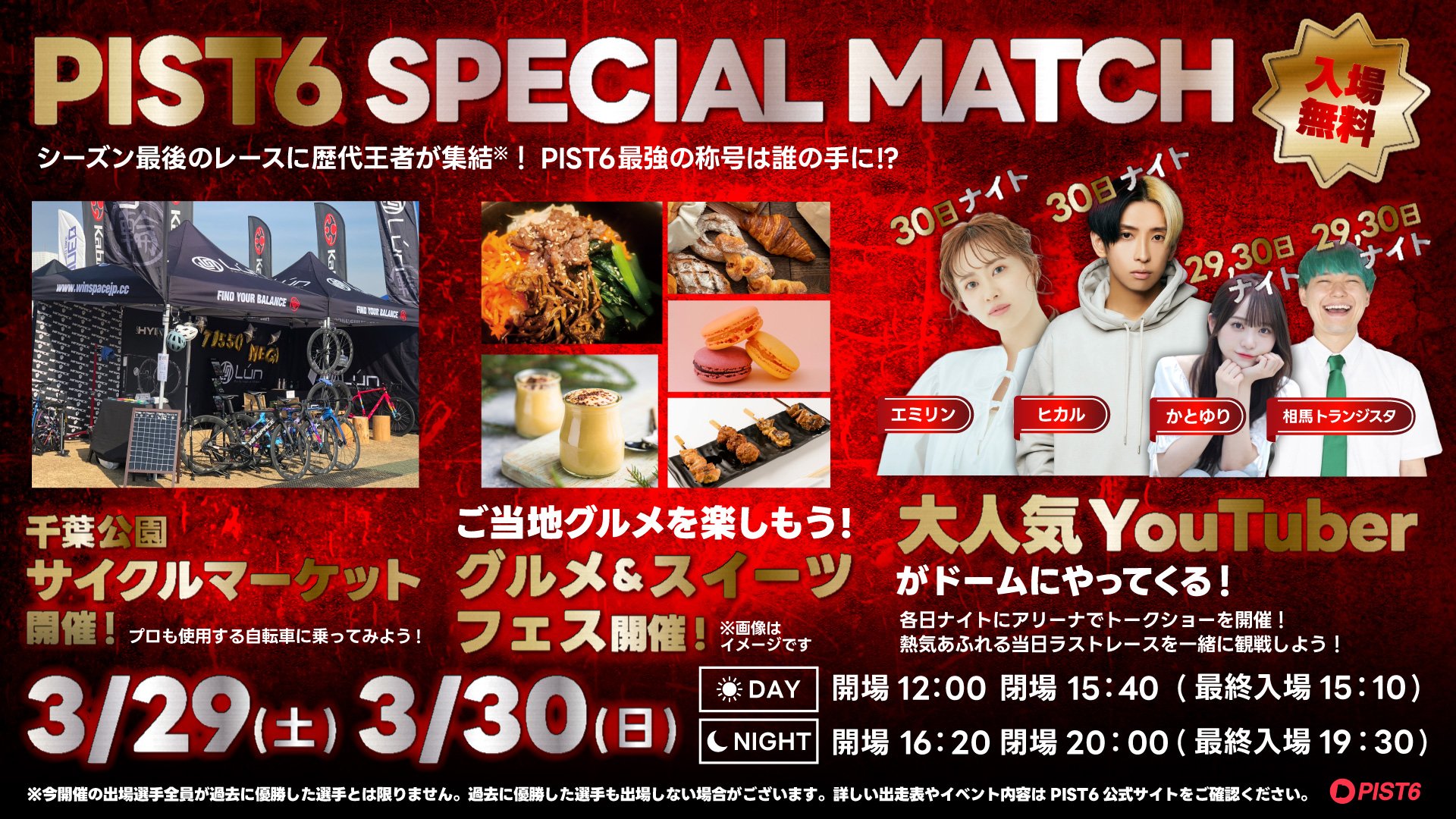 3/29(土)-30(日)のPIST6開催では千葉開府900年記念レース『PIST6 SPECIAL MATCH』を実施いたします。2024-2025シリーズ最終戦にあたる今開催はシリーズを通して活躍した選手が大集結!ハイレベルな戦いの末、今年度最後の優勝者が決まるその瞬間をご覧ください!