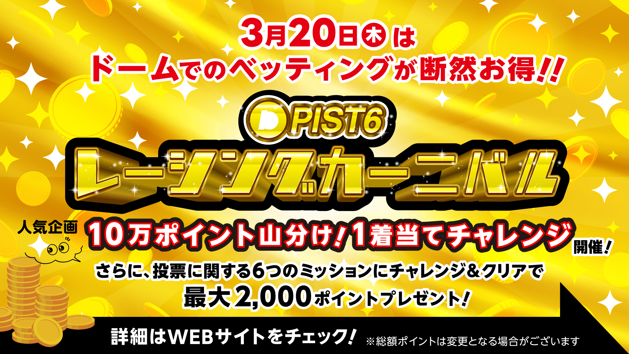 3/20(木)のPIST6開催では『PIST6レーシングカーニバル』を実施いたします。本イベントは「PIST6公式投票サービス」を用いた投票(ベッティング)体験イベントとなっております。