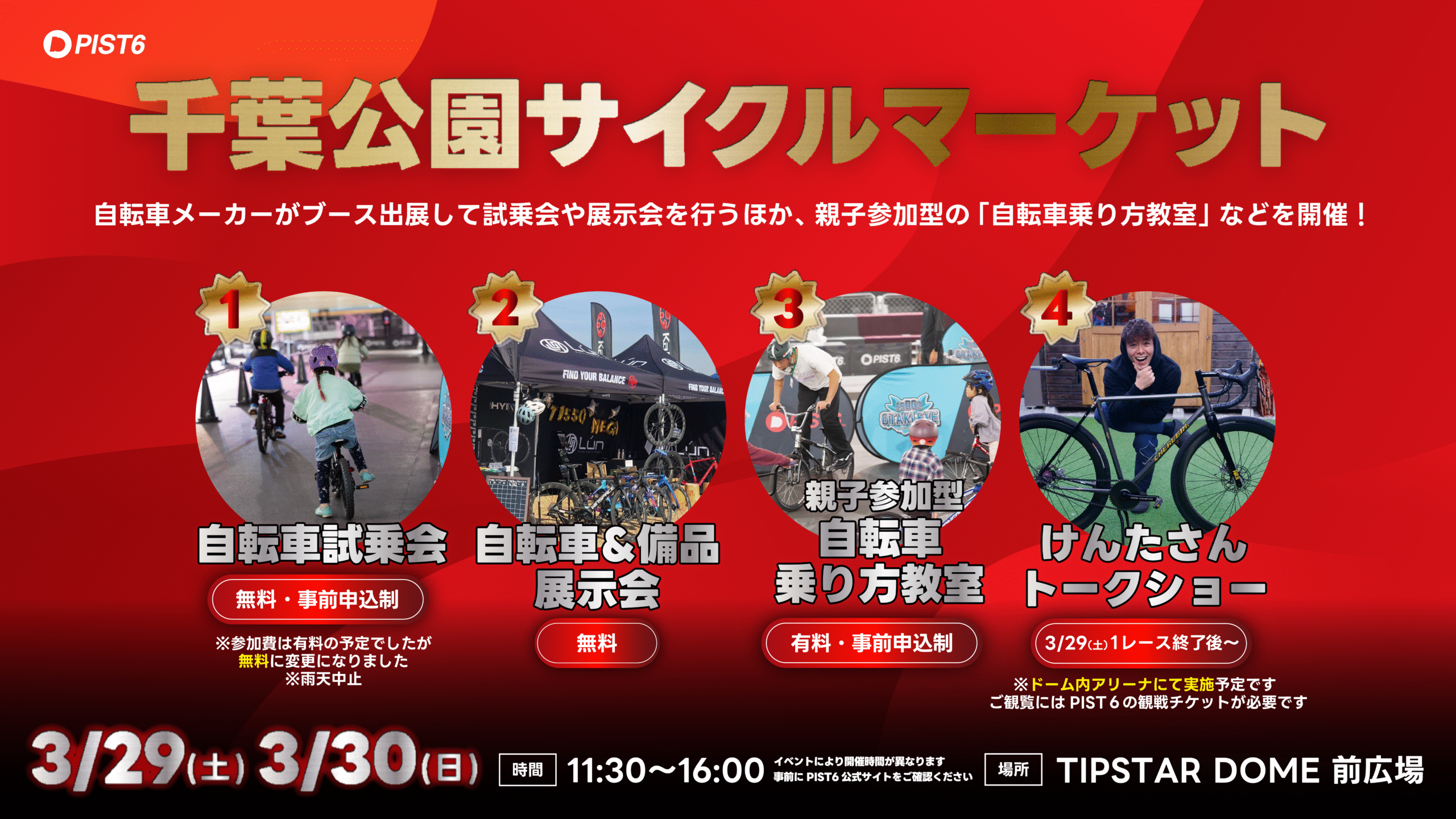 3/29(土)に予定されていた「千葉公園サイクルマーケット」内コンテンツ、「試乗会」と「自転車乗り方教室」につきましては、雨天予報により3/29(土)のみ中止とさせていただきます。3/30(日)に関しては明日実施の判断をして、お知らせいたします。