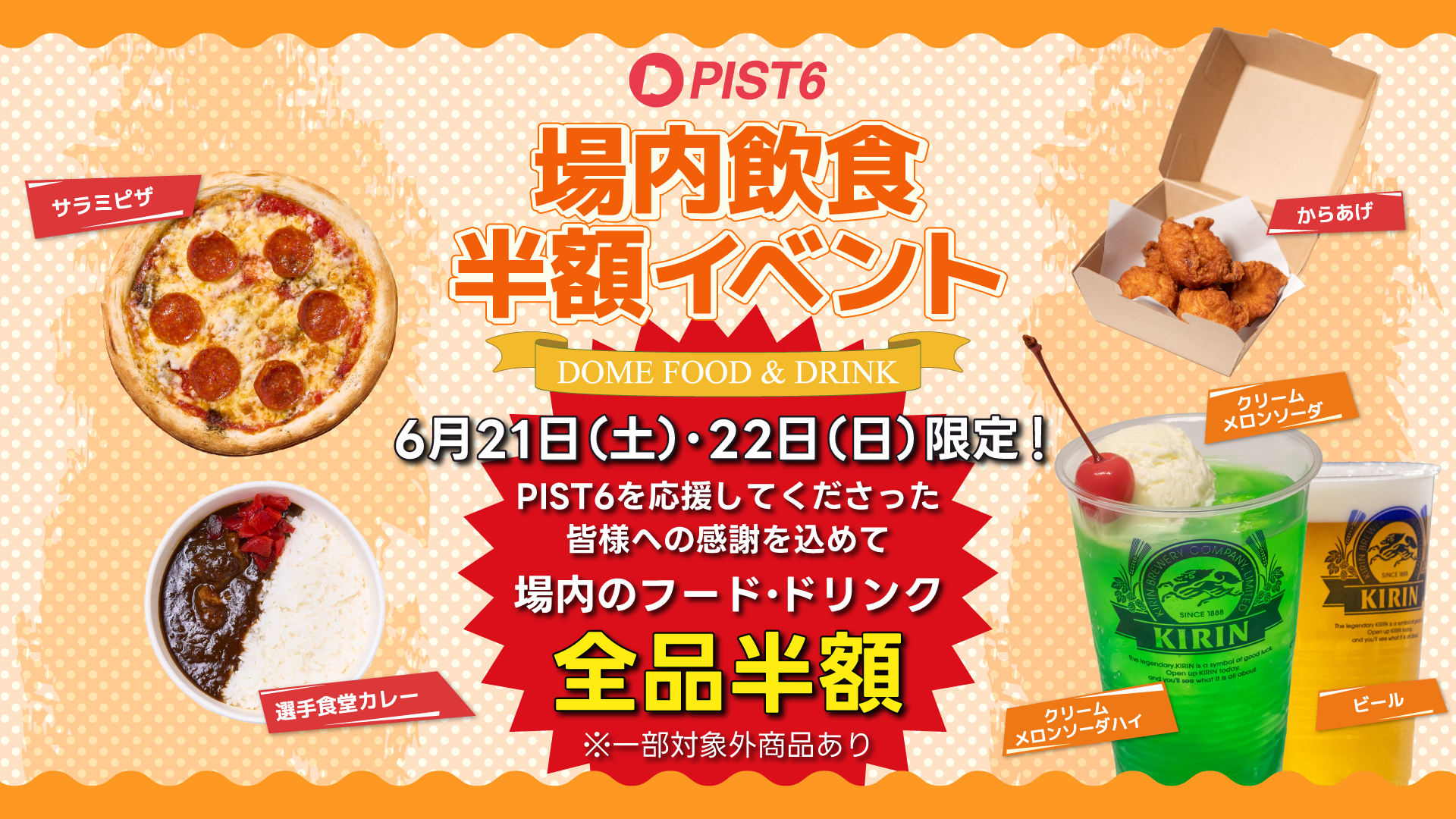 6/21(土)-22(日)のPIST6開催では、場内飲食半額イベントを実施いたします。初夏の中、快適な涼しいドーム内でおいしいフードとともにPIST6レースをお楽しみください。
