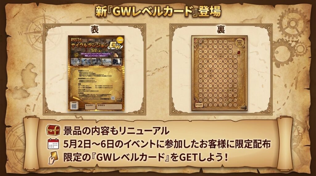 サイクルダンジョンでレベルを上げると景品がもらえる『レベルカード』の限定バージョン『GWレベルカード』配布決定✨レベルアップでもらえる景品もリニューアルしております💎