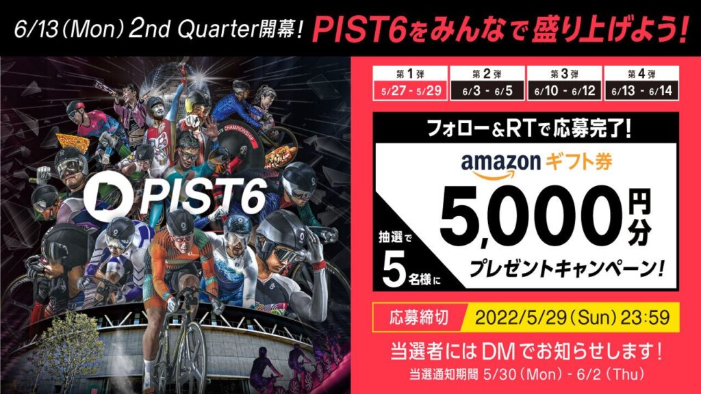 PIST6の公式Twitterアカウント( @pist6_official )にて、2022年5月27日(金)~5月29日(日)、6月3日(金)~6月5日(日)、6月10日(金)~6月12日(日)、6月13日(月)~6月14日(火)の計4期間、フォロー&対象の投稿をリツイートで抽選で5名様にA... -