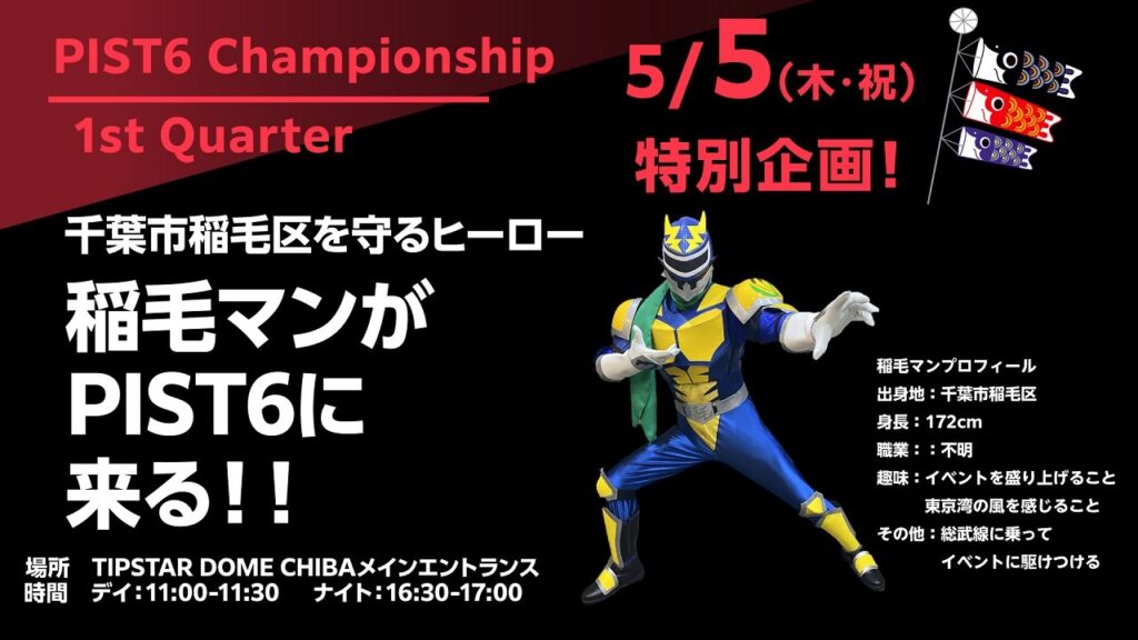2022年5月5日(木・祝)、こどもの日特別企画として、千葉市稲毛区の平和を守るNEWヒーロー『稲毛マン』がPIST6に参上します!当日はメインエントランスに『稲毛マン』が登場し、ご来場の皆様をお出迎えいたします。ぜひこの機会にTIPSTAR DOME CHIBAへお... -