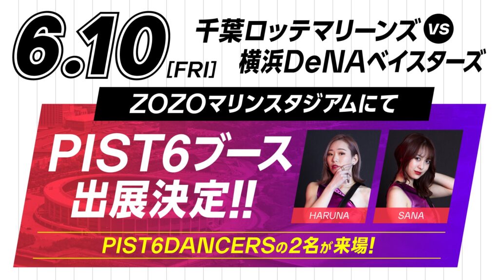 2022年6月10日(金)、千葉ロッテマリーンズvs横浜DeNAベイスターズが開催される、ZOZOマリンスタジアムにてPIST6のブースを出展することが決定しました。当日は、特別企画としてPIST6DANCERS(=PSD)からHARUNA、SANAがブースに登場予定です!また、PIST6の... -