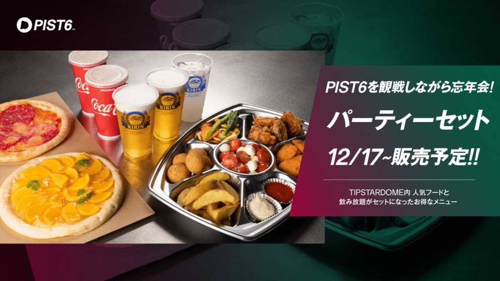 12月17日(土)からのPIST6開催において、フードセットと飲み放題が一緒になった『パーティーメニュー』の提供を行います。職場の仲間とPIST6を観戦しながらの忘新年会や、休日にご友人やご家族を誘ってのご利用など、様々なシーンで是非ご利用ください。 PI... -