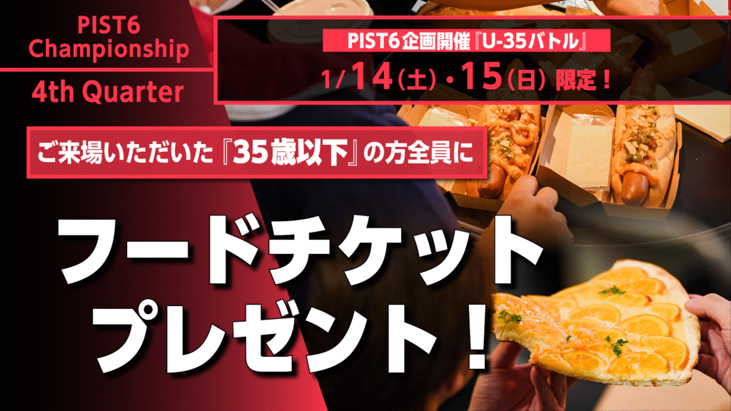 【U-35バトル 特別イベント】35歳以下の皆様へ『フードチケット』プレゼント 1月14-15日のPIST6は、35歳以下の選手が中心に参戦する企画開催『U-35バトル』が行われます。 その開催にちなんでの特別イベントとして、ご来場いただいた『35歳以下』の来場者... -